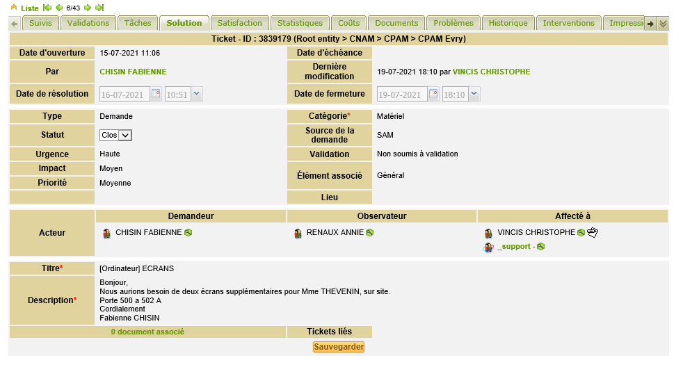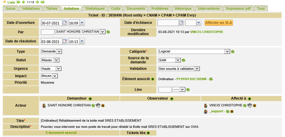 Lors de mon stage à la CPAM de l'Essonne en tant que technicien support informatique, j'ai été amené à résoudre des problèmes/demandes des utilisateurs via un logiciel de gestion de tickets appelé GLPI. Il existe 3 niveaux de support informatique, j'ai effectué du support N1 et N2, cela concerne les problèmes non-bloquant et bloquant.